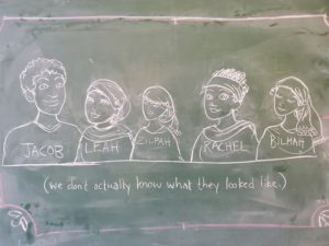 We discussed: how might this story be different, from different perspectives? After all, these women aren’t just babymamas with drama, they’re interesting people in their own right. What if Rachel and Leah were telling the story — would they talk about how they felt about their dad’s trick? What if Bilhah and Zilpah were telling it — do they maybe want to focus on something other than babies sometimes? What were these people like, what did they do all day, what might be in their stories?